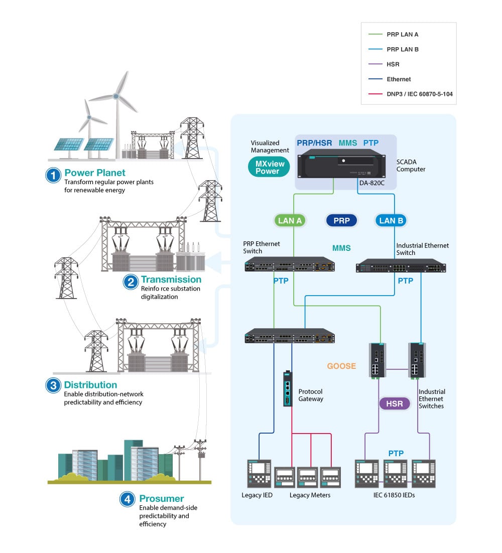 To assist customers in making the transition to digital transformation in their substations, Moxa has developed and integrated a PRP/HSR, PTP, and MMS solution with visualized management based on its experience with 7500 substations around the world.