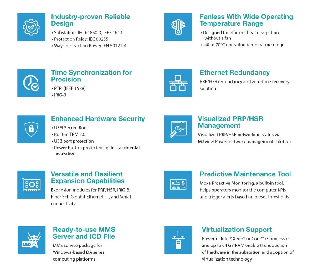 Moxa’s DA-820C, a high-performance robust 3U rackmount industrial computer with PRP/HSR, PTP, and MMS integration and hardened protection, is ideal for transforming your substation to a smart IEC 61850 substation.